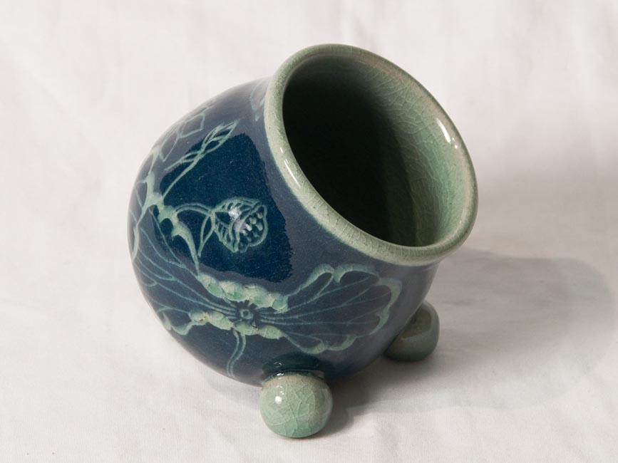 This celadon salt pig is decorated with traditional Korean carving of a dragonfly over a marine blue slip. Whether you're a gourmet chef or want to spruce up your cooking space, this celadon salt pig is a great addition to any kitchen.